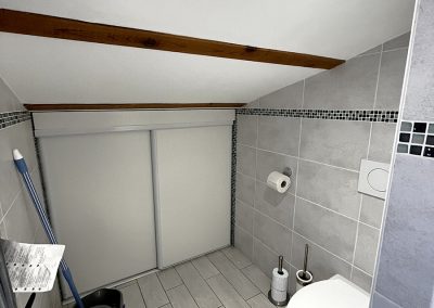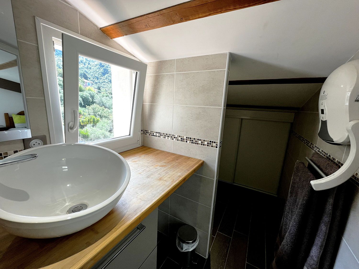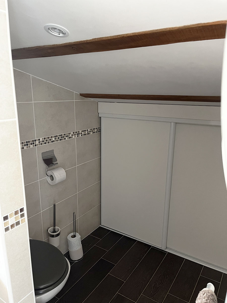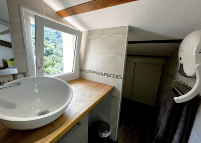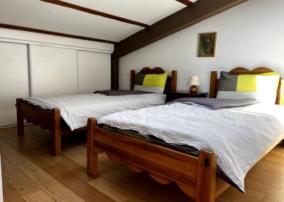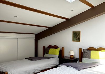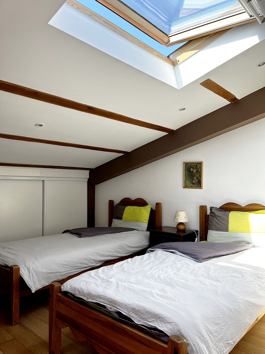 Une belle chambre composée de 2 lits simples, de nombreux rangements sous pente et d’une salle de bain privative avec douche, toilette et lavabo. Cette chambre et la salle de bain sont baignées de lumière grâce à une fenêtre sur toit et une autre dans la salle de bain.