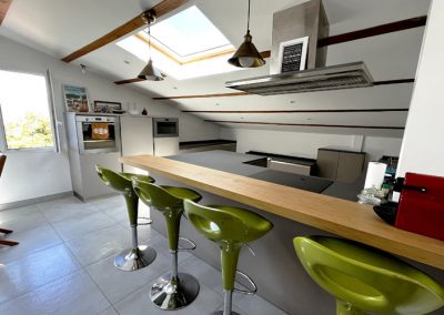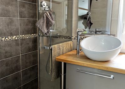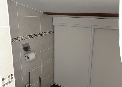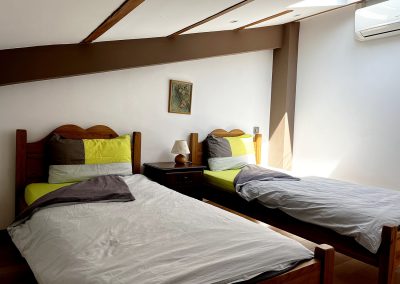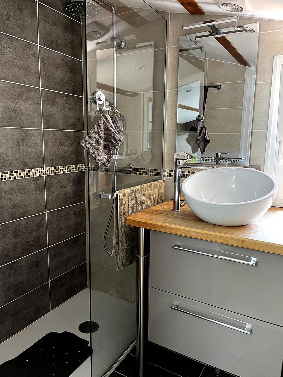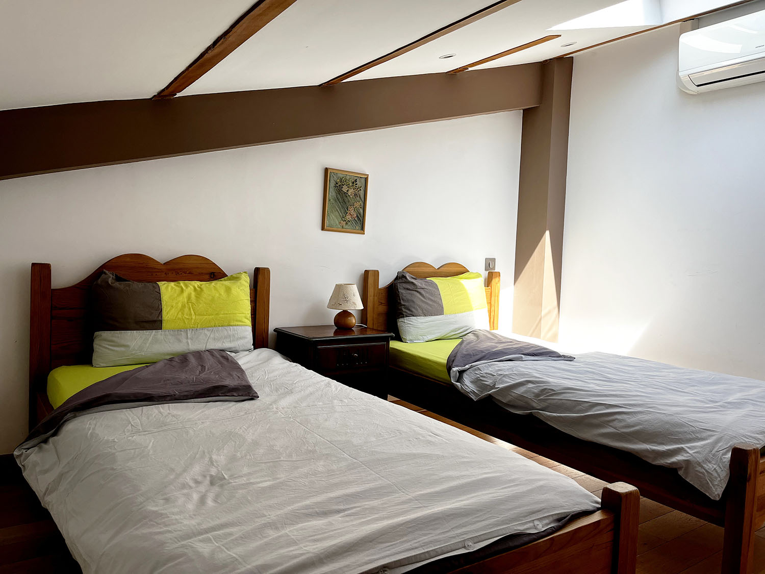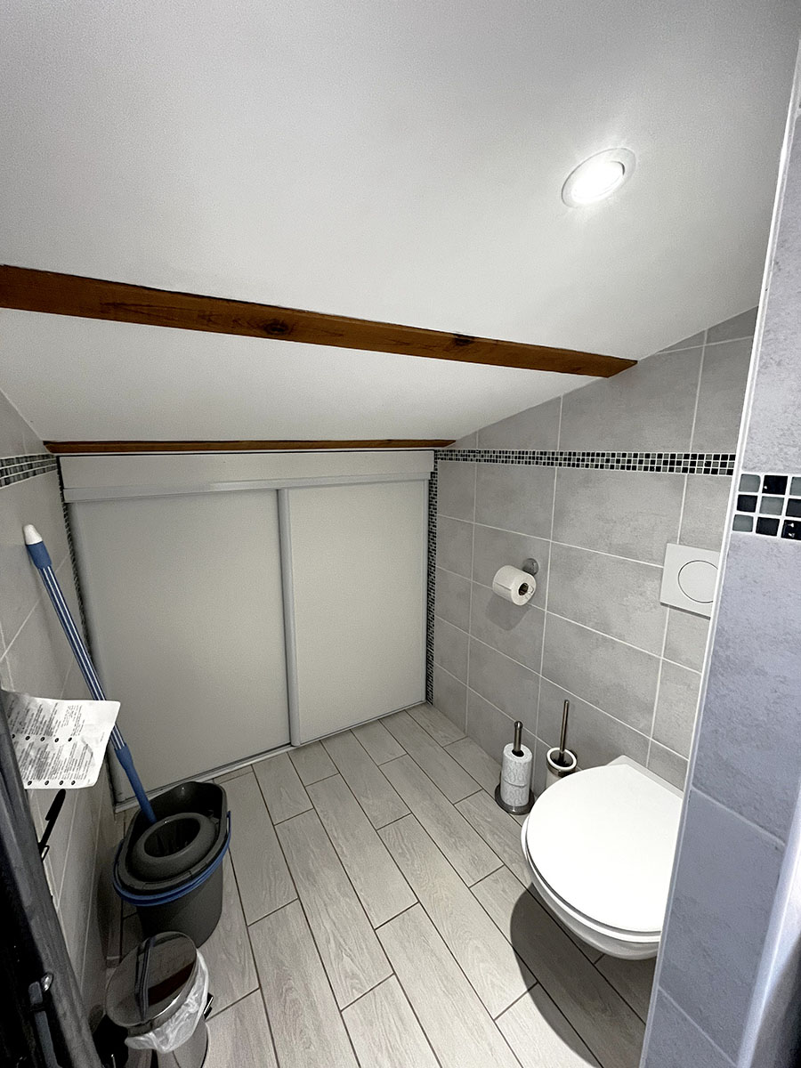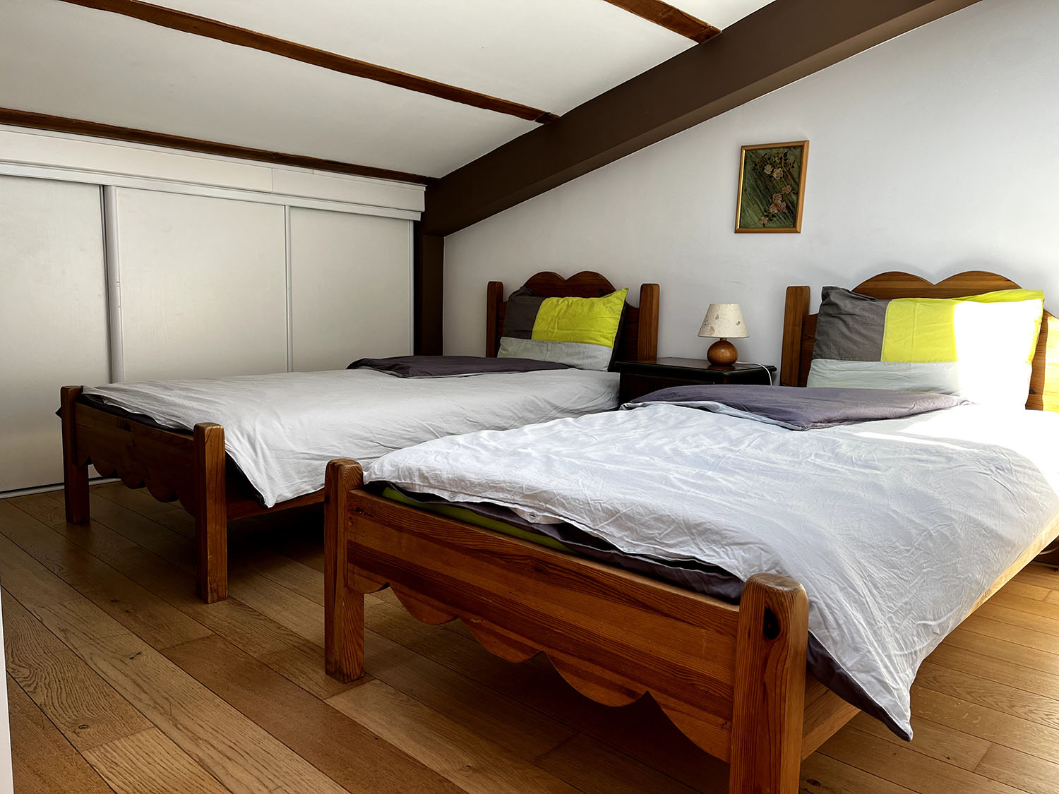 Une belle chambre composée de 2 lits simples, de nombreux rangements sous pente et d’une salle de bain privative avec douche, toilette et lavabo. Cette chambre et la salle de bain sont baignées de lumière grâce à une fenêtre sur toit et une autre dans la salle de bain.