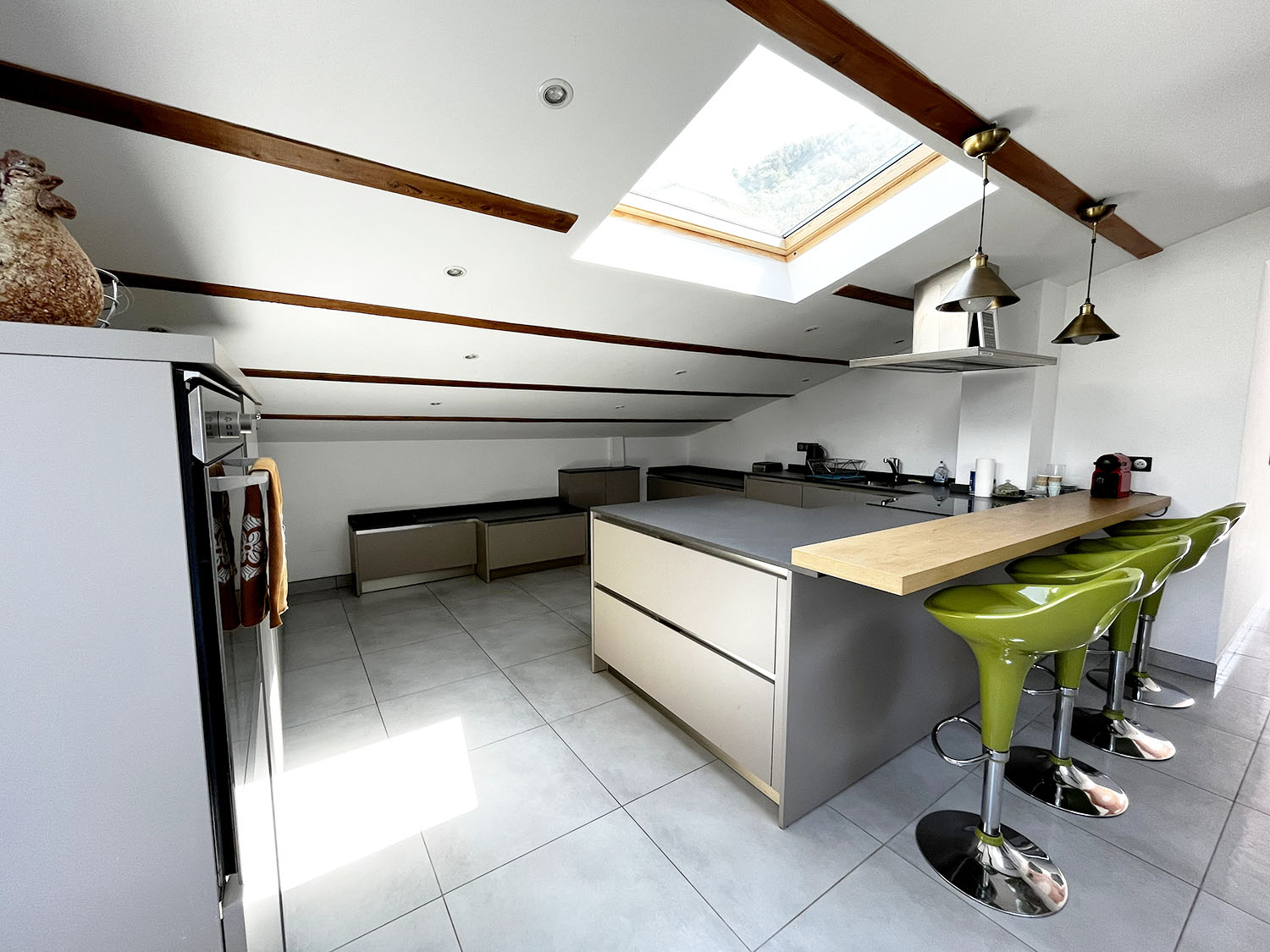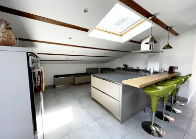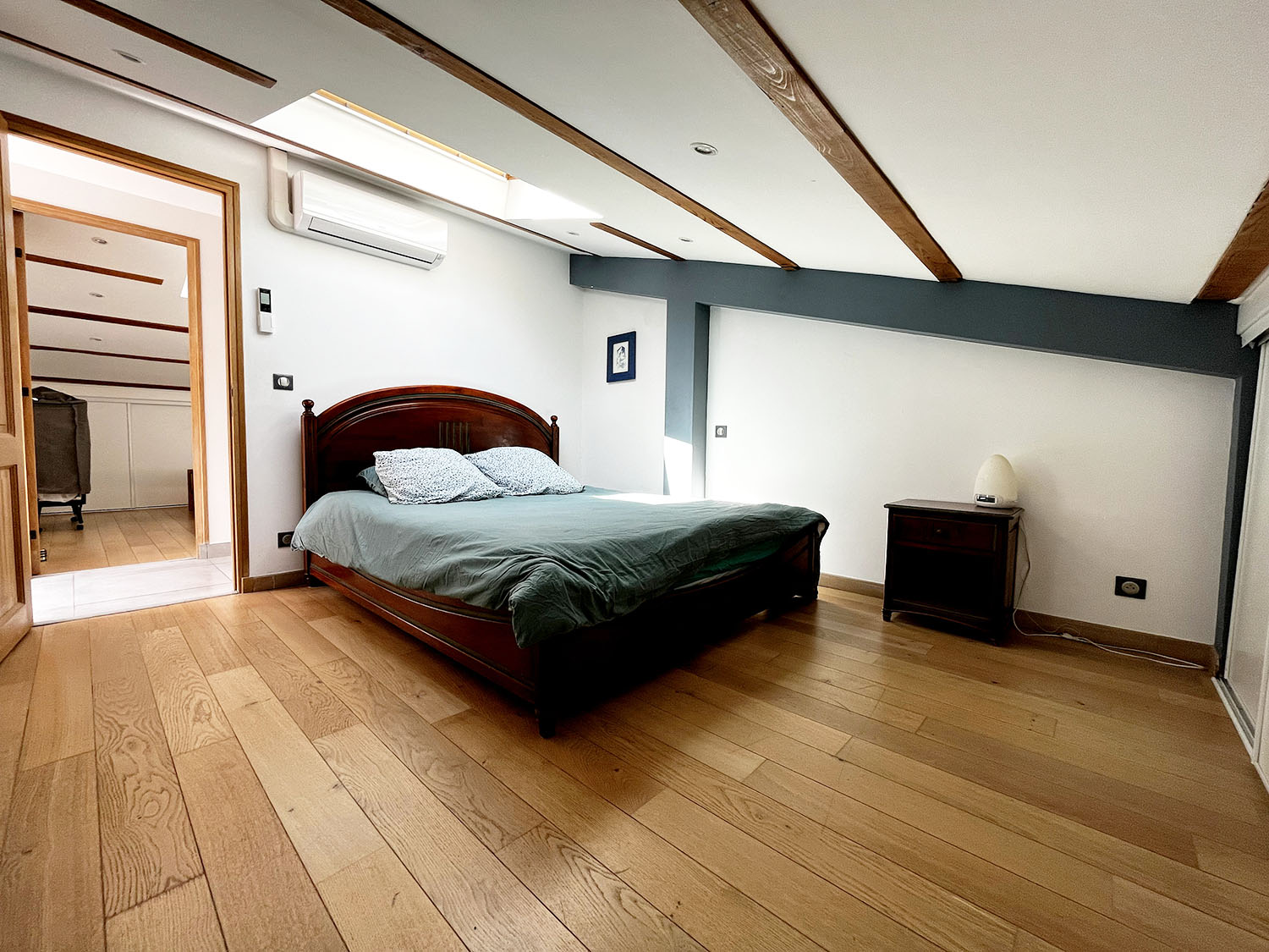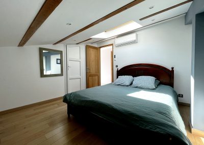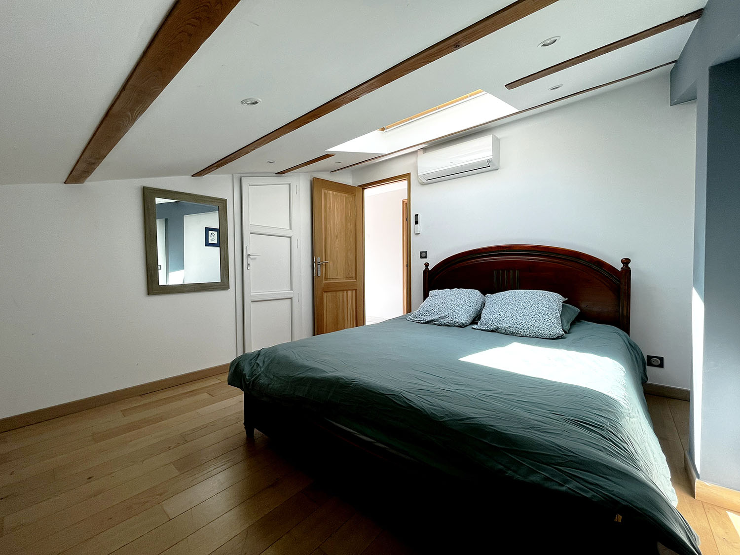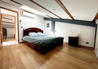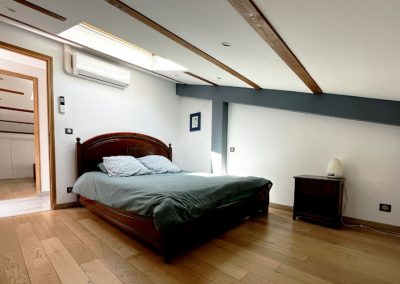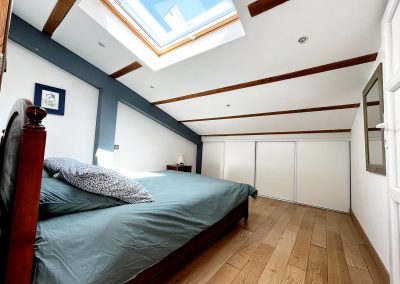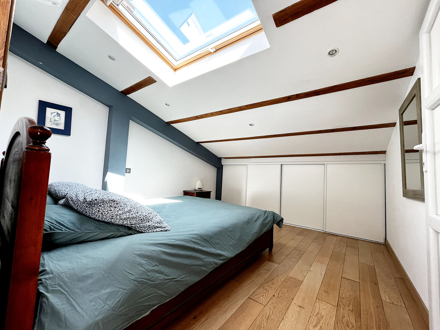 Une magnifique chambre parentale mansardée de xm2 comprenant un lit double, un espace de rangement sous pente et une salle de bain privative avec douche, toilette, lavabo, machine à laver. Une fenêtre dans la salle de bain et une fenêtre sur toit dans la chambre apportent une belle luminosité à cette suite parentale.